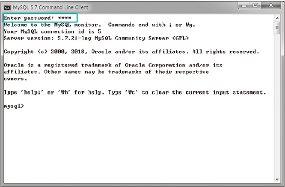 윈도우의 <시작> 버튼을 클릭하여 MySQL 5.7 Command Line Client를 실행한 후 root 계정의 비밀번호를 입력하여 MySQL이 제대로 설치되었는지 확인