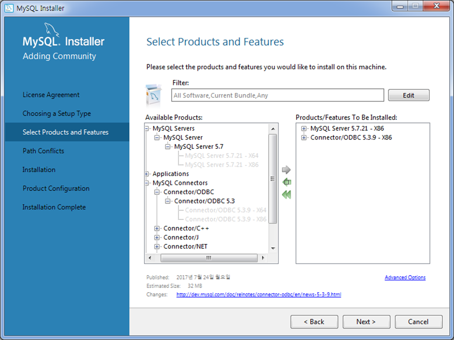 설치 대상을 선택하는 화면의 왼쪽 목록에서 MySQL Server의 아래쪽에 있는 ‘MySQL Server 5.7.21-X64’와 MySQL Connectors의 아래쪽에 있는 ‘Connection/ODBC5.3.9-X64’를 선택한 후 오른쪽 방향 초록색 화살표를 클릭하여 오른쪽의 목록으로 이동하고<Next>를 클릭.