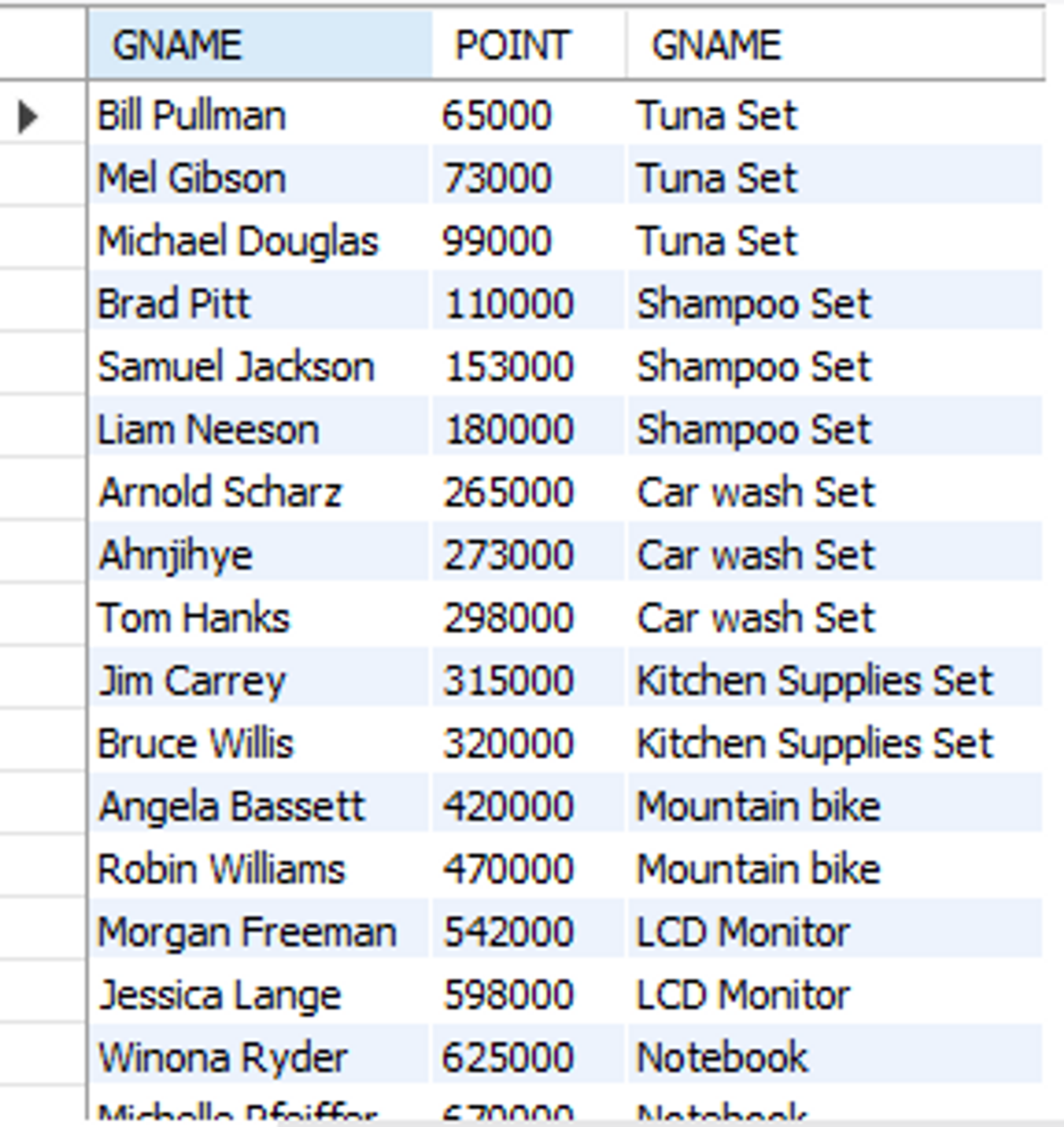 SELECT CUST.GNAME, CUST.POINT, GIFT.GNAME