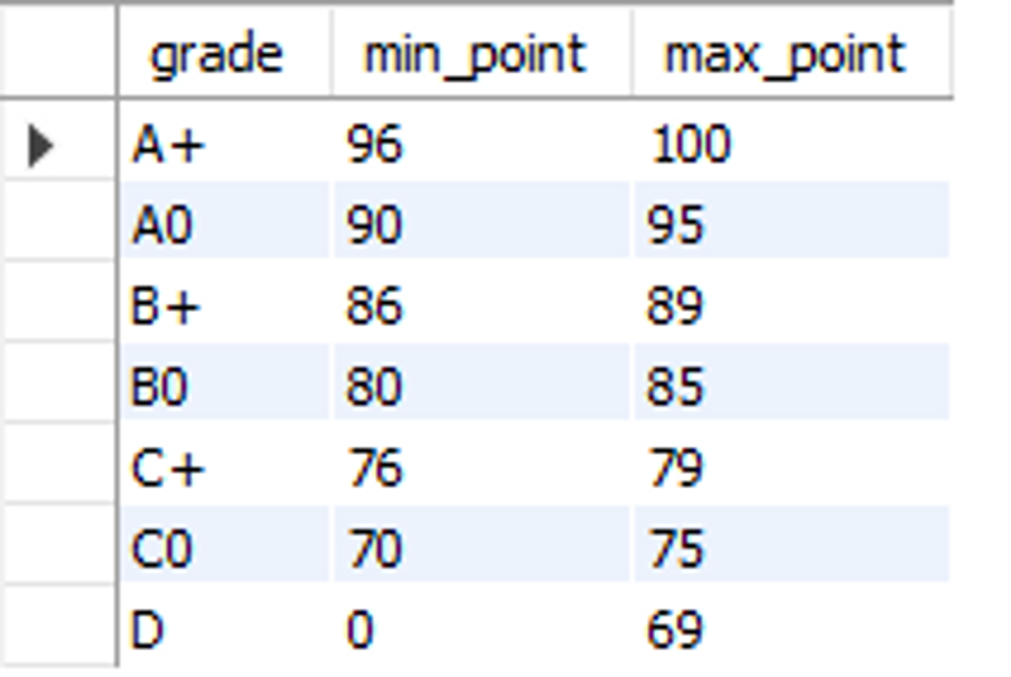 WHERE (STU.STUDNO = SCORE.STUDNO) AND (SCORE.TOTAL BETWEEN H.MIN_POINT AND H.MAX_POINT)